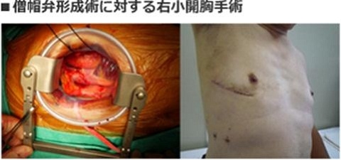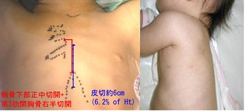 Patent ductus arteriosus (PDA) is, if it is too thick catheter therapy is unsuitable, by only very small incision (about 1.5cm) of the left chest, a hole of 2 to 4 locations only, and a combination of thoracoscope, closed. Usually, children were discharged from the hospital in the next day because the chest did not cut large. Even if children are grown, they have no deformation of the thorax and wound do not stand out.