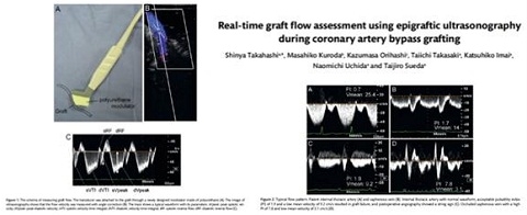 The patency of coronary artery bypass grafting (CABG) is usually assessed by postoperative coronary angiography (CAG), which is reliable but not ideal because cardiac surgeons would prefer to know the condition of coronary artery perfusion during the operation. Surgeons commonly determine the success of a graft anastomosisby direct palpation. However, this technique is subjective, indirect and unreliable. Intraoperative manual diagnosis cannot accurately predict when revision of a graft is necessary to avoid graft occlusion. There are several techniques for graft assessment during the operation: thermal CAG using an infrared camera, laser-assisted indocyanine green angiography, electromagnetic flow meters, transittime flow meters (TTFMs), pulsed Doppler flow meters and colour pulsed Doppler. We have introduced a triangular-shaped silicone and gel interposed between an echo probe and a bypass graft as a means of recording graft flow. This technique guarantees the patency of bypass grafting and our overall patency after postoperative coronary angiography is approximately 98%, which is affected by our challenging spirits to anastomose of grafts to more difficult, small and poor coronary arteries.