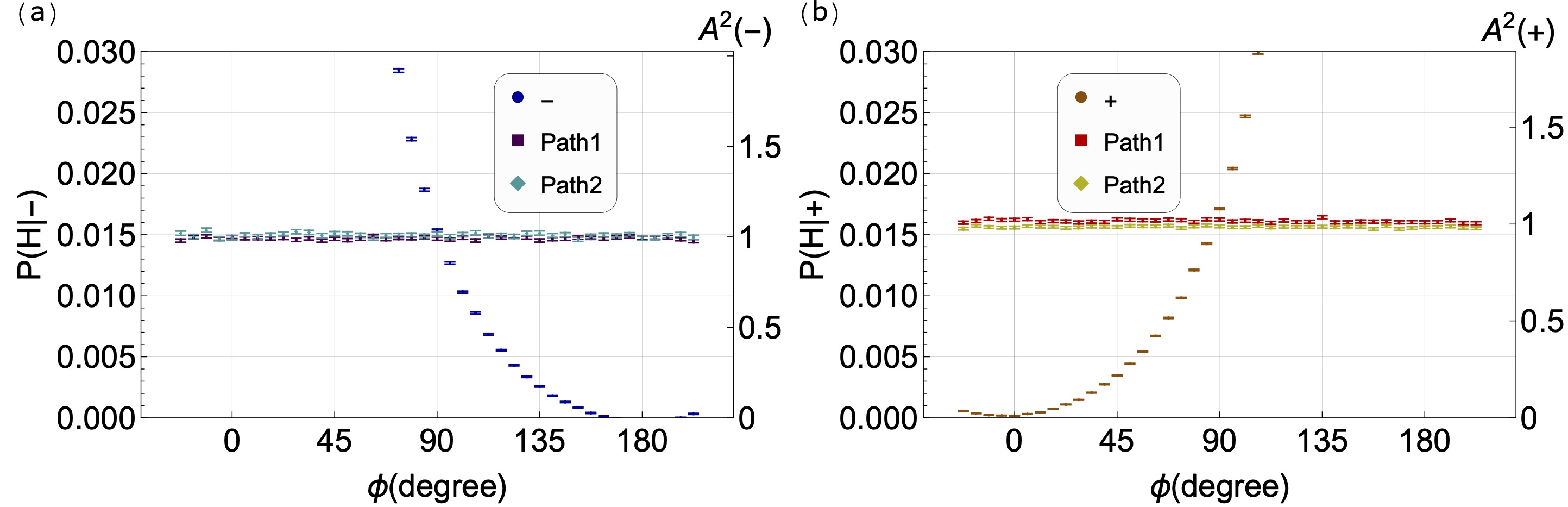 Method for observing photon delocalization. Vertically polarized photons are injected into a two-path (BS) interferometer. HWP1 rotates the photon polarization by a small angle (+θ), and HWP2 rotates the photon polarization in the opposite direction by the same angle (-θ). Localized photons all flip with the same probability, P(H|1) = P(H|2). When interference is observed, the polarization flip probabilities P(H|±) observed in the output ports change, where lower flip probabilities indicate that the local rotations can cancel each other. The flip probabilities P(H|±) thus provide direct evidence for the delocalization of photons inside the interferometer. (Ryuya Fukuda, et al. New Journal of Physics. March 23, 2026)