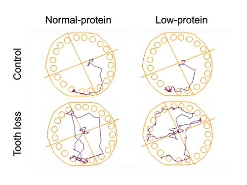 At 3 months of age, mice underwent either tooth extraction or a sham operation and were assigned to one of four groups: control group with a normal-protein diet, control group with a low-protein diet, tooth loss group with a normal-protein diet, and tooth loss group with a low-protein diet. Behavioral testing and brain analyses were conducted six months later. (Courtesy of Rie Hatakeyama)