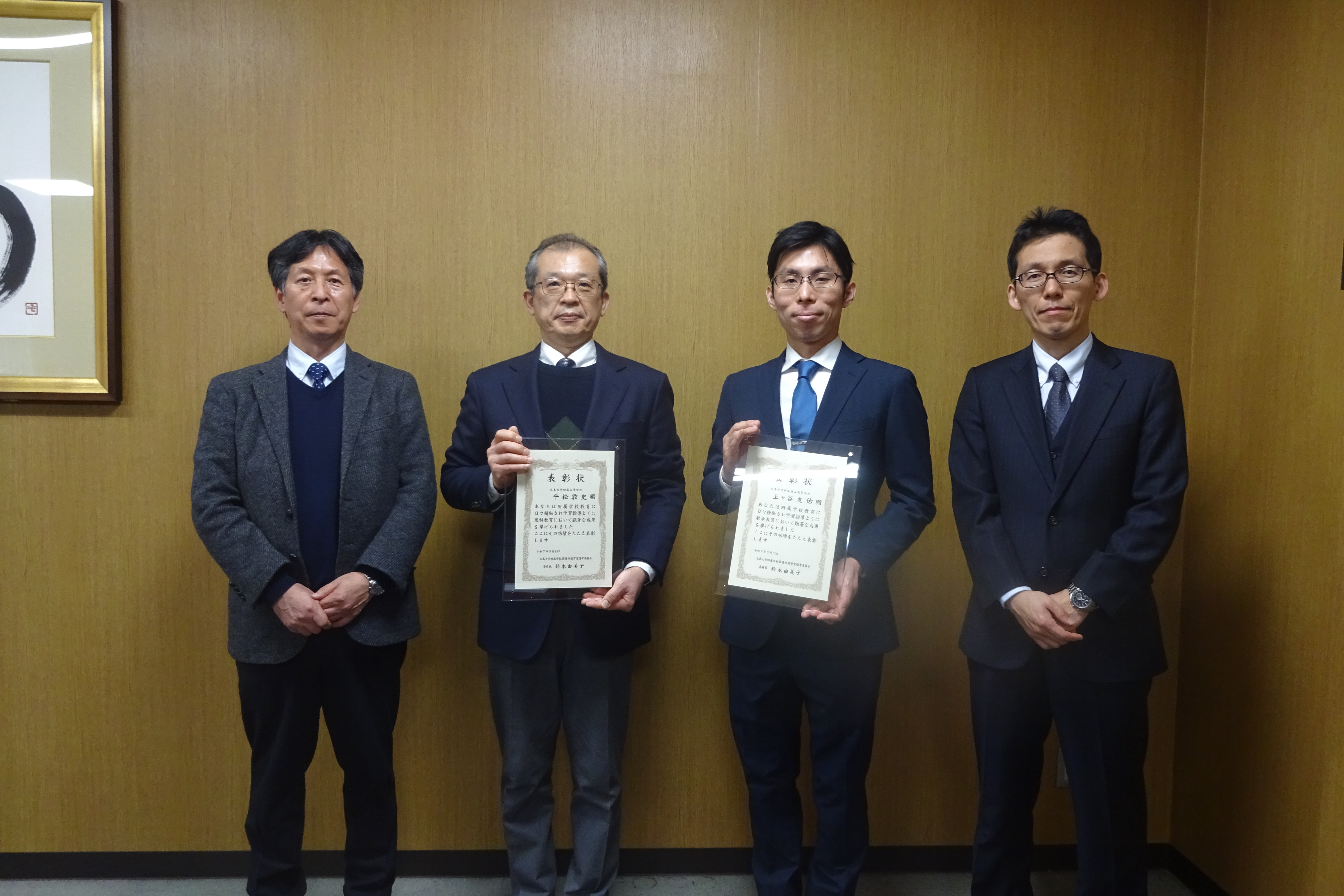 同表彰式では、学習指導とくに理科教育における顕著な成果により広島大学附属高等学校の平松敦史教諭、及び学習指導とくに数学教育における顕著な成果により広島大学附属福山高等学校の上ヶ谷友佑教諭が由井副理事(附属学校担当)から表彰状を受け取り、大きな拍手でその栄誉が称えられました。