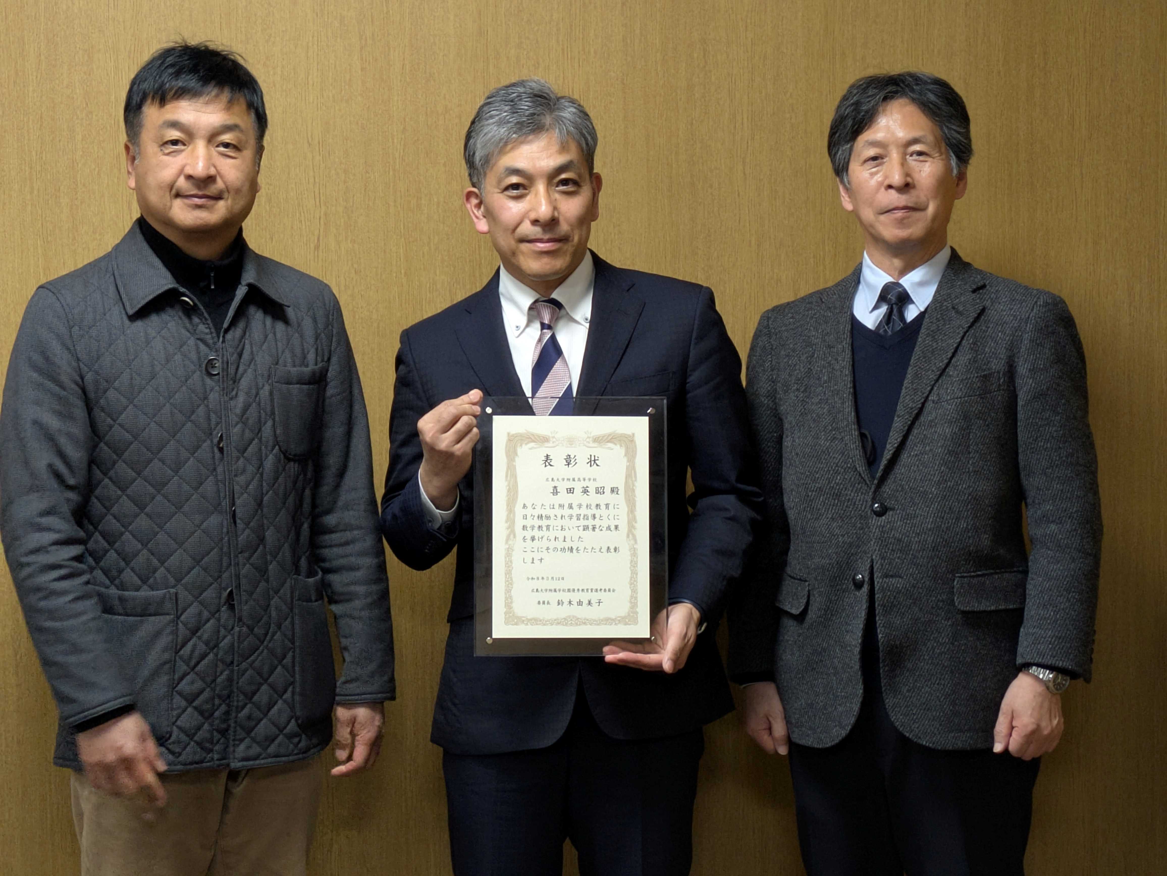 本年度は、広島大学附属高等学校の喜田英昭教諭が受賞されました。喜田教諭は、長年にわたる全国算数・数学教育研究大会での発表や日本学生科学賞を受賞した生徒の指導などが評価されました。