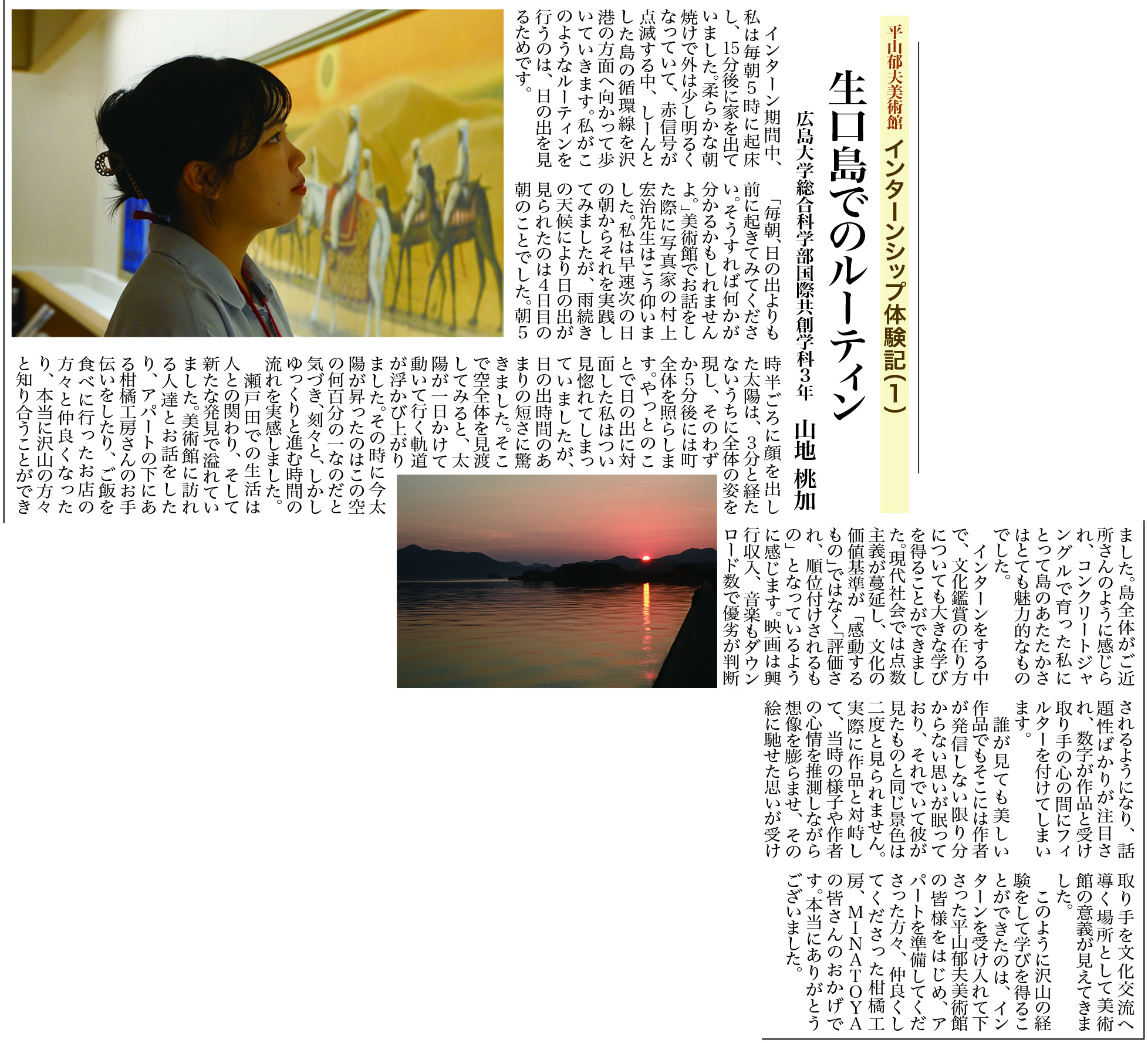 国際共創学科3年の山地桃加さんが、広島県尾道市瀬戸田町にある平山郁夫美術館にてインターンシップを行いました。