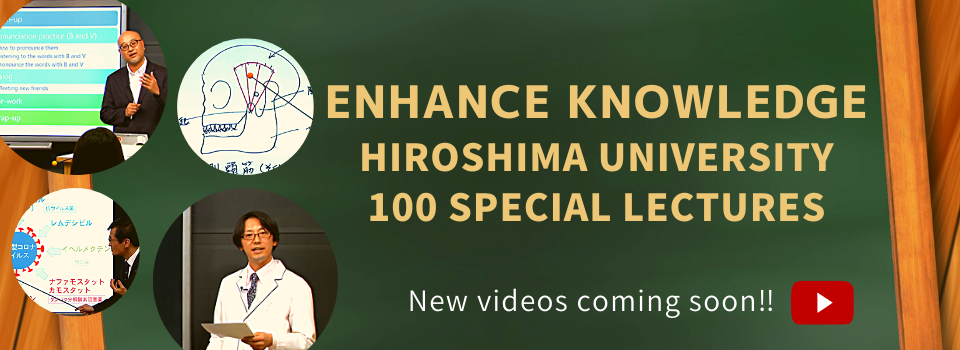 The contents include some of our faculty members' special lectures about their classes and research in a lecture titled "Enhance knowledge -Hiroshima University 100 special lectures-". We hope you will actively watch the lectures you are interested in.