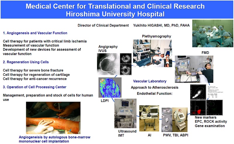 Recently, new kinds of treatment methods have been developed, including regenerative medicine using iPS cells and cell therapies, and studies have been conducted into the practical use of these treatment methods. The Medical Center for Translational and Clinical Research supports the clinical application of these new treatment methods at the research stage, and also promotes the development of new therapies. Currently, we are conducting studies on revascularization therapy against arteriosclerosis obliterans and Buerger's disease, cartilage regeneration for the treatment of articular cartilage lesions in the knee, and the clinical application of post-operative immunomodulating therapy to prevent serious infection after hepatic transplantation.