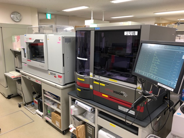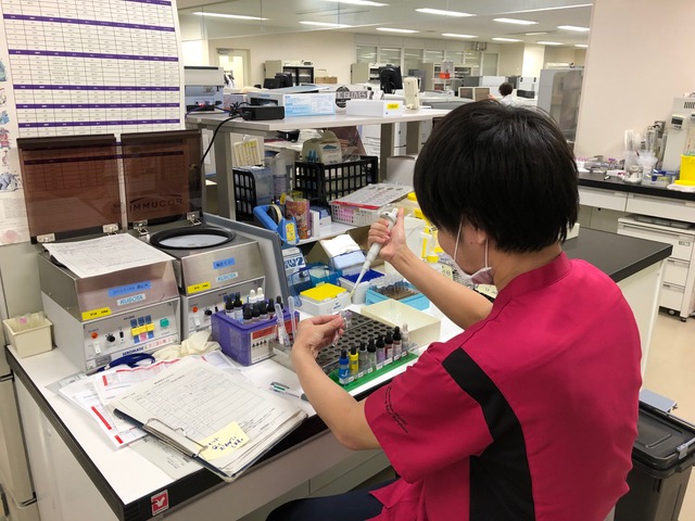 The Division of Transfusion Medicine currently comprises four doctors, one nurse and nine laboratory technicians. To perform safe and proper transfusion at a hospital, we supervise the management of blood products including albumin, deal with transfusion reactions that have occurred, and report them to the Blood Center as necessary, treat and store allogeneic hematopoietic stem cells, carry out tests related to transfusion, HLA typing tests and pre-deposit autologous blood collection, and maintain and improve transfusion therapy manuals. In the case that a transfusion reaction occurs repeatedly in a patient, we also prepare washed red cells or washed platelets at the request of each medical department.