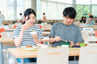 一人暮らしの学生の食生活を考慮して、食材・栄養バランス・おいしさにこだわりながら、手頃な価格のメニューを用意しています。また、軽食やドリンクを楽しめるカフェや喫茶スペース、コースランチメニューのあるレストランも設置しています。