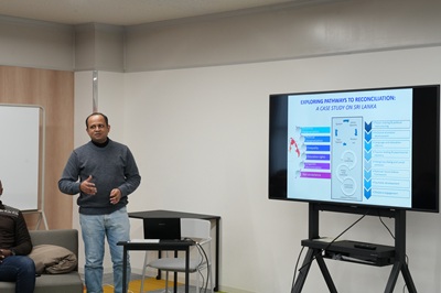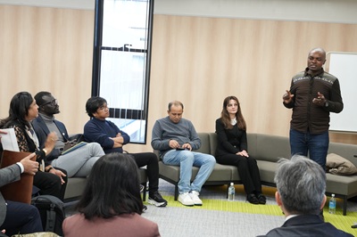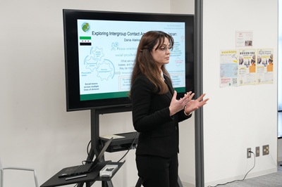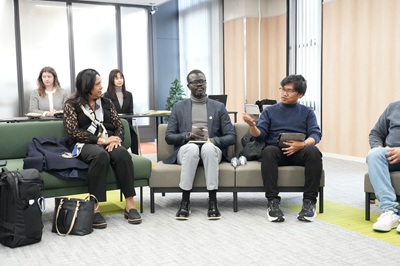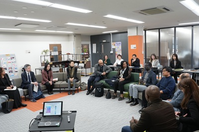 理事表敬後には、本学教員および学生との意見交換が行われました。片柳真理教授(大学院人間社会科学研究科)、シマンガン・ダリア・コリャード准教授(IDEC国際連携機構)、山根達郎准教授(大学院人間社会科学研究科)ならびに学生5人が参加し、研究や実践を踏まえた活発な意見交換が行われました。学生からは、平和構築、難民支援、偏見緩和などをテーマとした研究発表が行われ、紛争下の性的暴力が社会・経済構造と深く結びついている現状が共有されました。パッテンSRSGからは、学術研究と国連の政策課題との連携の重要性が示され、学生の今後の研究への期待が述べられました。