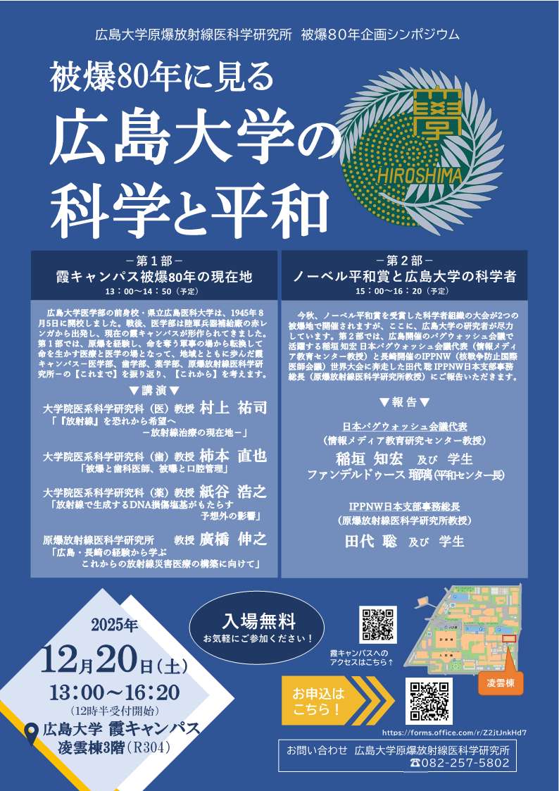 この度、「被爆80年に見る広島大学の科学と平和」と題し、以下のとおりシンポジウムを開催いたします。