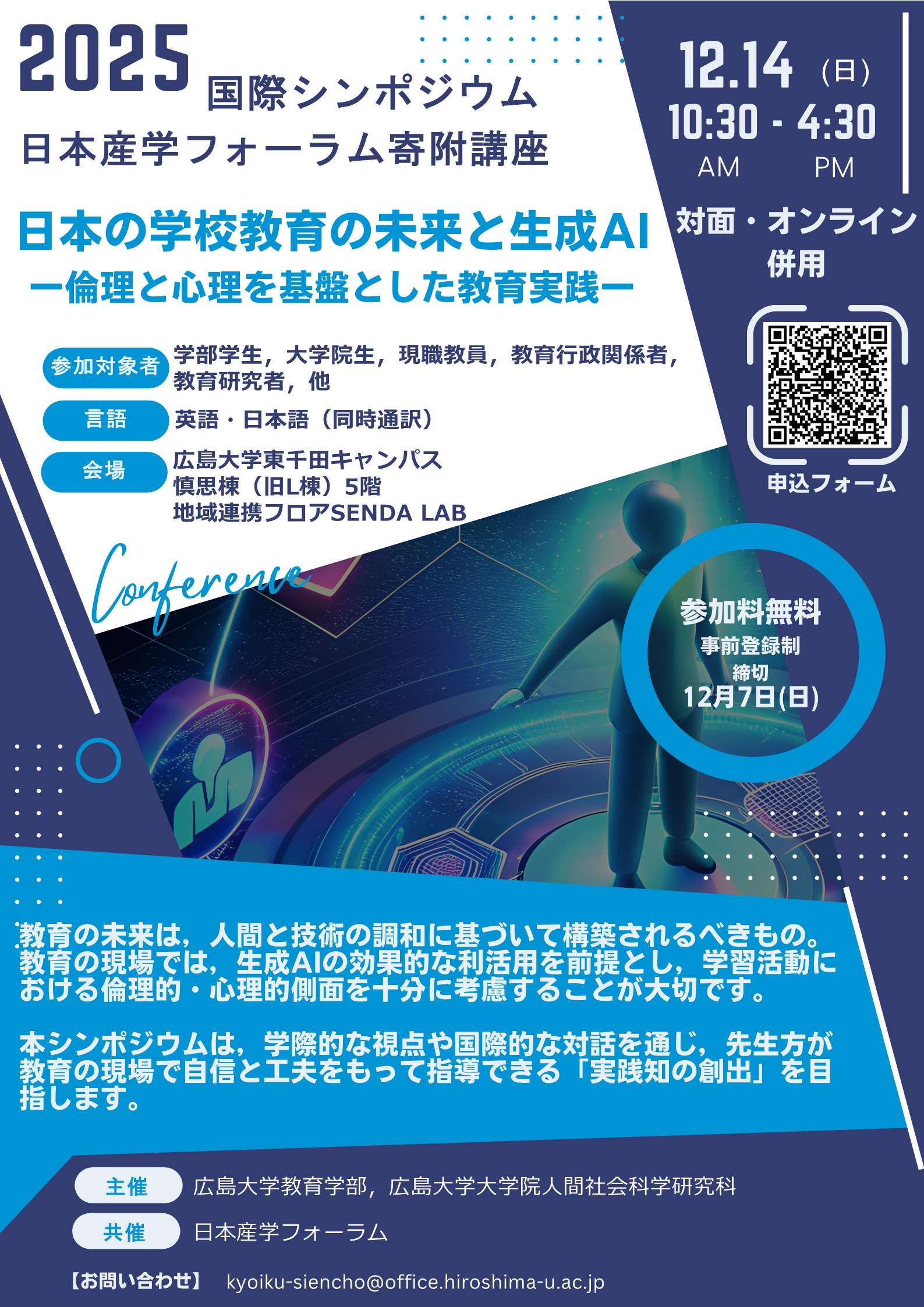 広島大学教育学部には、令和5年11月1日から2年間、日本産学フォーラムの寄附によって、寄附講座「子供の多様性を感じて育てる教育体験×教員研修インターンシップ講座」が開設されました。この2年間、寄附講座ではインターンシッププログラムの実施やシンポジウム開催を行ってまいりました。このたびは国際シンポジウムを開催いたしますので、皆様のご参加をお待ちしております。