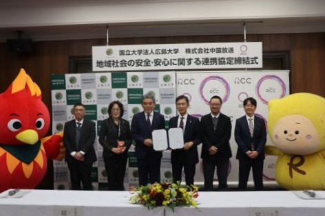 2025年12月15日、広島大学は、東広島キャンパス法人本部棟において、越智光夫学長および株式会社中国放送 宮迫良己代表取締役社長の出席のもと、株式会社中国放送(RCC)と「地域社会の安全・安心に関する連携協定」を締結しました。