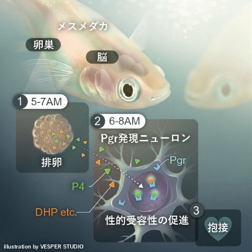 一般に魚類のメスが産卵するためには、卵巣に発達した卵がある状態でオスを受け容れるといったように、卵巣の状態と性的受容性を同期させることが重要です。しかし、卵巣の状態を脳に伝え性的受容性を制御する神経内分泌メカニズムがどのようなものなのか、その詳細は明らかになっておりませんでした。