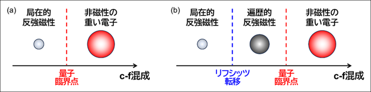 (a)ドニアック相図の概念。c-f混成が弱い領域は局在的な反強磁性、強い領域は非磁性の重い電子状態。両者は量子臨界点で隔てられる。量子臨界点とは相転移が起こり物質の状態が大きく変わる場所。(b)拡張されたドニアック相図。中間に遍歴的な反強磁性の領域が割り込む。局在的な反強磁性の領域とは、リフシッツ転移で隔てられている。図中の円により、c-f混成が等方的であることを象徴的に示す。