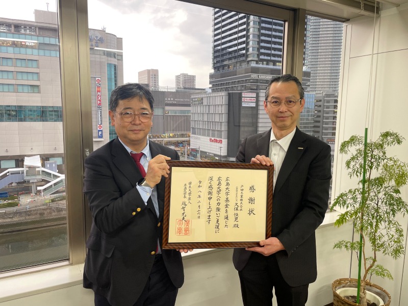 このたび、広島大学冠事業基金をはじめ、本学基金へ長らくご寄付を継続くださり、本学へ多大なるご支援を賜りましたことから、感謝の意を表し、名誉校友の称号と感謝状を贈らせていただきました。