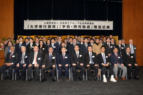 2月26日に行われた贈呈式典には片桐 一彰教授が本学を代表して参列し、スピーチでは「長年、社会の中で洗練されてきた古典的な基盤技術の中にこそ、新たな技術の種が隠れている。学生とともに新鮮な視点から古典的な技術を見直すことによって、目立たずとも将来性を秘めた技術の種を見出し、大切に育む必要がある。想定を超える視点を持って、古典的な”ある技術“と”ある技術”を融合するなど、技術の温故知新を積み重ねることが技術革新の本質と考えている。住友の事業精神の通り、浮利を追わず、地道に新たな技術を開発し、航空宇宙分野を中心にあらゆる分野への展開を試みたい」とコメントしました。
