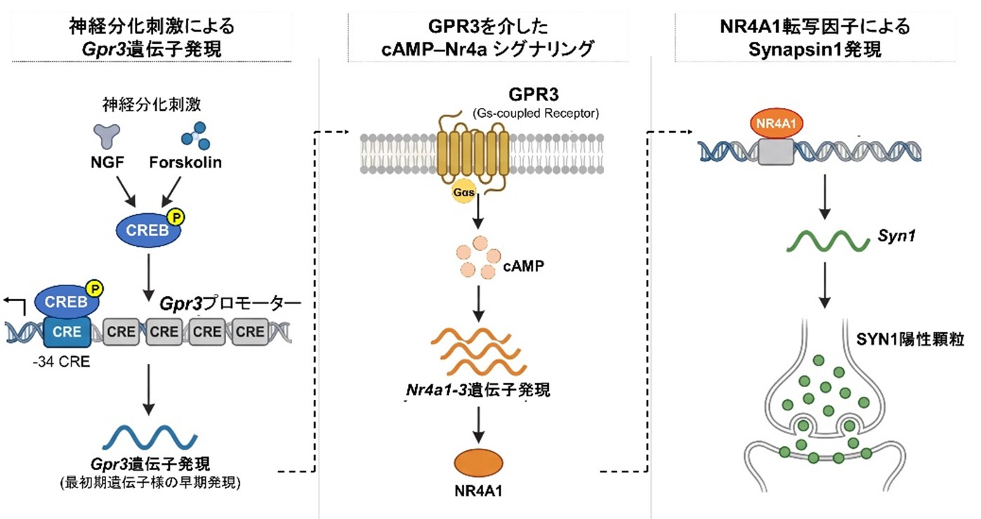 神経分化刺激によりCREBが活性化され、GPR3遺伝子の発現が刺激後早期に一過性に上昇する。誘導されたGPR3は細胞内シグナル伝達を増幅し、転写因子NR4Aファミリーの発現を促進する。NR4A1はSynapsin1遺伝子の転写を活性化し、シナプス前終末形成を制御する。