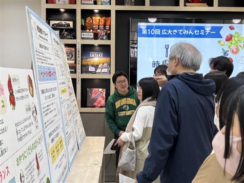 2026年3月14日・15日、広大きてみんセミナー「時間栄養学×フルーツ」を開催しました。昨年度に引き続き、時間栄養学の研究をされている、広島大学大学院医系科学研究科公衆衛生学の田原 優 准教授と田原研究室大学院生で管理栄養士である田頭侑茉さんが講師を務め、研究で分かった果物の健康効果を体験しながら、おやつの重要性を学ぶセミナーを開催いたしました。