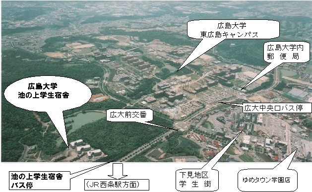 池の上学生宿舎は、西条駅と広島大学を結ぶ片側2車線の市道(通称ブールバール)沿いにあり、西条駅から4km、広島大学から500mの場所にあります。