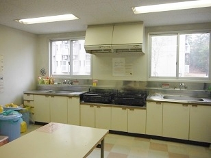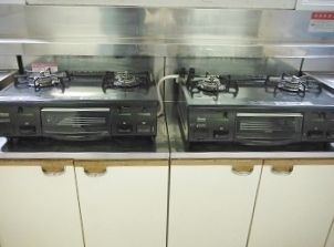 ガスコンロ(二口用2台)、流し台、食器棚、テーブル、椅子 |
