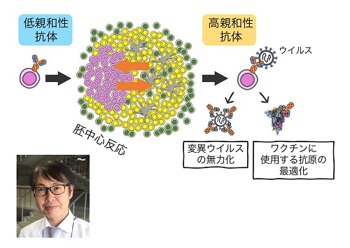 新型コロナウイルスなどの感染が起こった宿主ではウイルスを中和する活性を持った抗体が作られます。しかしこれは体の中に最初から存在するのでなく、弱く結合する抗体が形を変えながらより強い結合力を持った抗体へと進化を繰り返すことで生み出され、ウイルスの排除にとても重要です。私たちの研究室では抗体をつくるB細胞がリンパ組織の胚中心と呼ばれる場所で抗体の結合力を上昇させる仕組みについて研究しています。多岐に変異したウイルスに対し強力に結合する抗体遺伝子を体から取り出す技術や免疫反応を人工的に体外で起こす技術を開発することで有効な抗体を取得し、人類にとって脅威となる病原体に対抗するためのワクチン開発や医薬創生に貢献していきます。