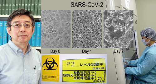 新型コロナウイルスに立ち向かうべく、医学・歯学・薬学・保健学の医療系の研究室が一丸となって(名称:広島大学CoVピースプロジェクト)、PCR検査体制の確立、ウイルス治療薬の探索、ウイルス検査方法の簡便化などの多方面のプロジェクトを進めています。ウイルス学研究室は、その中心としてP3高度封じ込め実験施設での新型コロナウイルス培養実験を行っております。始まってまだ間もないですが、すでに学内の薬剤シーズの中からウイルス増殖を抑制する薬剤を見つけ、その標的である細胞側の蛋白質を同定しています。今後は早く成果を出してウイルス制御に貢献していきたいと考えています。