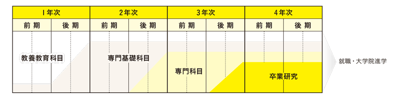 - 3 年次後期から指導教員を決定し、専門教育科目の履修と卒業論文のための研究を行います。