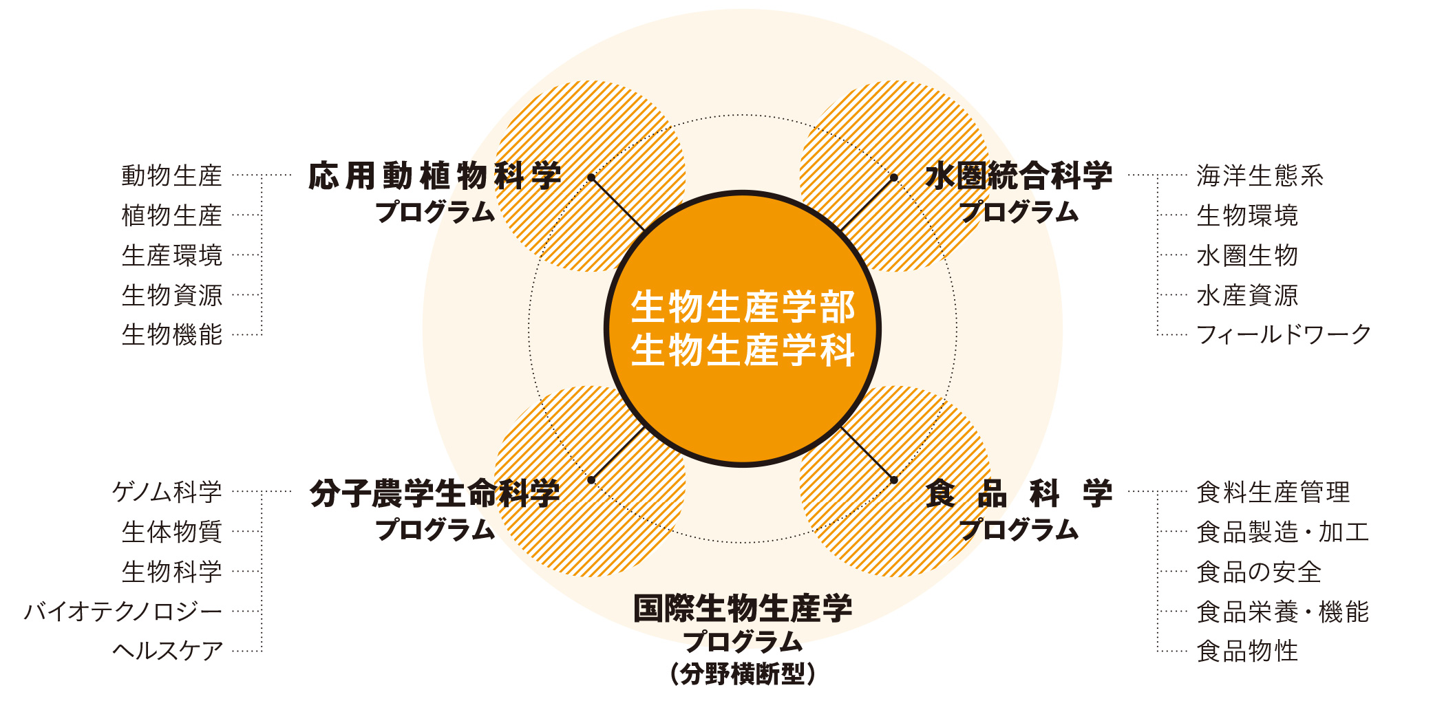 生物生産学部では、生物生産に係わる自然科学から社会科学に及ぶ幅広い知識と知恵を身に付けさせることを目標としています。具体的には、①食料生産、生物資源、生物環境、バイオテクノロジーに係わる基礎的知識の修得、②フィールド科学分野の体験学修、③生命倫理や科学技術の倫理の理解、④英語等の語学能力や情報処理能力の修得を目指した教育を行います。