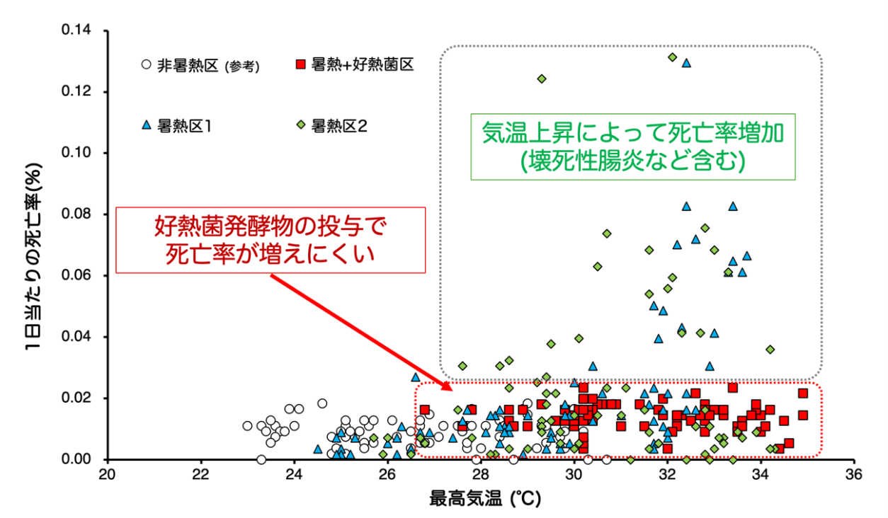 未利用海産資源を70~80℃で高温発酵させた飼料の希釈溶液(カルディバシラス・ヒサシイ含有)を飲水に添加し、1カ月間飼育した後における死亡率と最高気温との関係を示している。