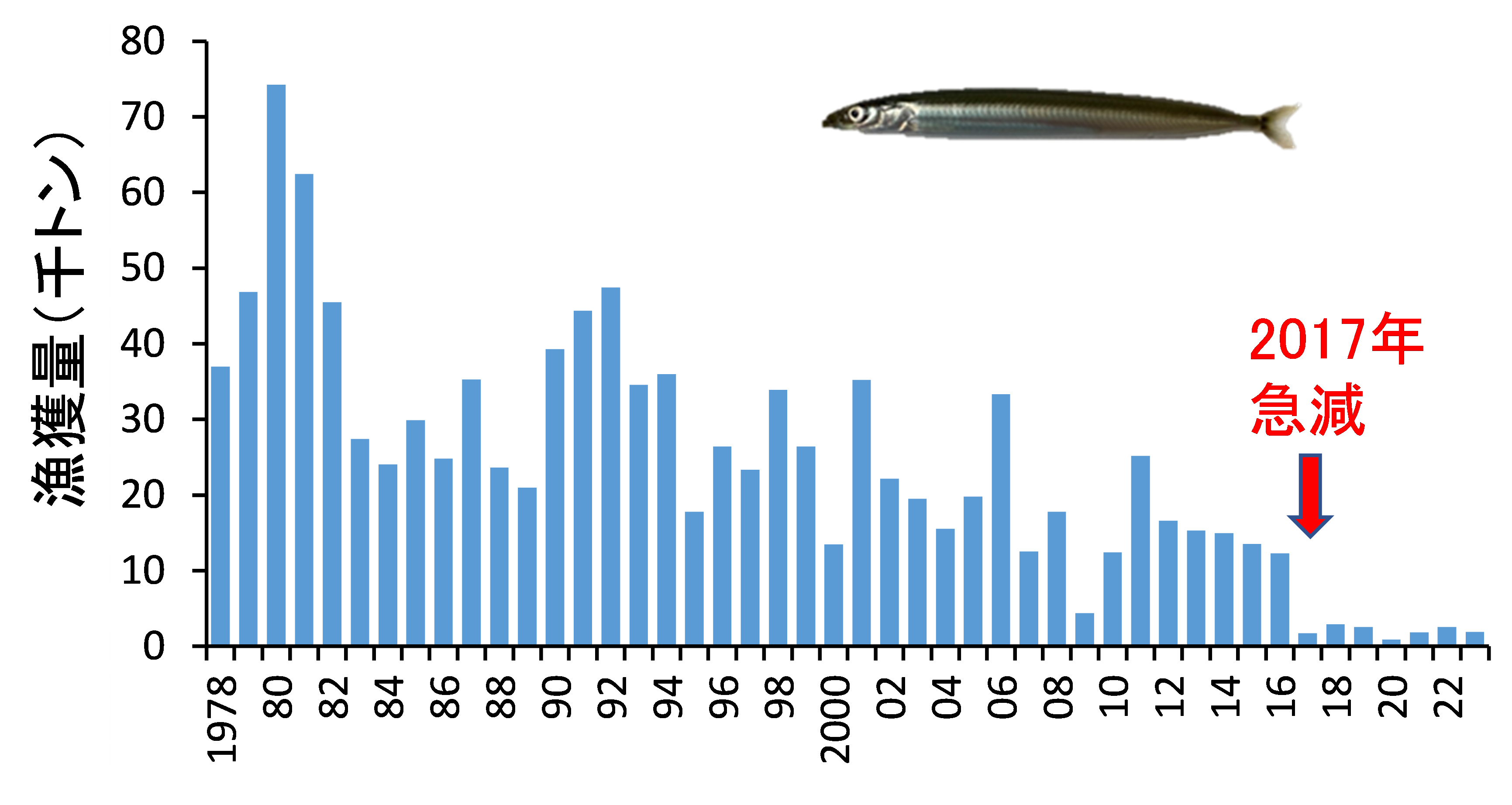イカナゴはイカナゴ科に属する小型魚で、瀬戸内海の東部、特に大阪府、兵庫県、香川県において重要な水産資源であり、3~4月にかけて漁獲される稚魚は「くぎ煮」の材料として広く親しまれてきました。瀬戸内海東部におけるイカナゴの漁獲量は、減少傾向にありながらも、2016年までは年間1万トン以上を維持してきました。しかし、2017年にイカナゴの漁獲量は前年の約1割まで急激に落ち込み、その後も回復せず、現在まで3千トン未満の低水準が続いています(図1)。これまで、この減少の背景として、「海がきれいになりすぎたこと(栄養塩濃度の低下)により、イカナゴの餌となる動物プランクトンが減少し、その結果、イカナゴの産卵量が低下した可能性」が指摘されてきました。しかし、餌環境の悪化や産卵量の減少は、通常は時間をかけて徐々に進行する現象であるため、イカナゴの漁獲量が2017年に突発的に大きく減少した理由は明確にはなっていませんでした。